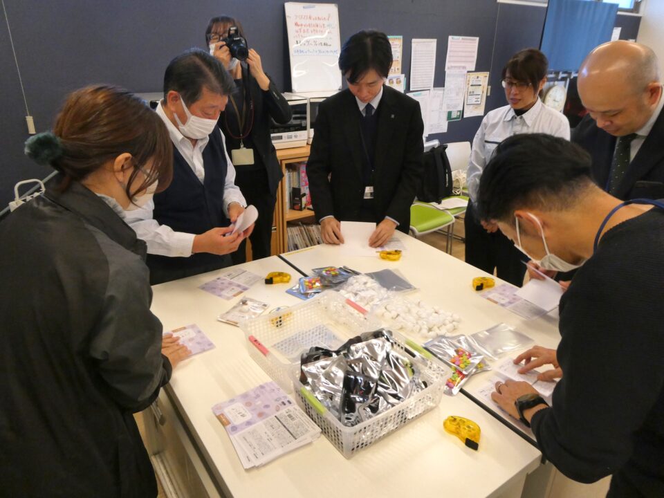 次はスマイル工房にご協力いただき、参加者全員で福祉作業所で行われている軽作業を体験。今回の内容は、鉱石をつけた指輪の袋詰め作業と、ドアの部品であるラッチベースの組み立てです。福祉作業所の方に教わりながら、慣れない工程に戸惑いながらも楽しい雰囲気で作業を進めていました。