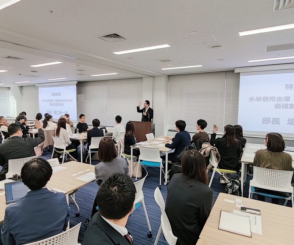 当日は、まず今回のプログラム開催に多大なご協力をいただいた多摩信用金庫 価値創造事業部 部長の堀江秀一さまからご挨拶をいただいたのち、当研究所 長島剛副所長(多摩大学経営情報学部 教授)から「多摩地域の事業構想と地域連携」と題し、当研究所の進める各プロジェクトの説明と、笑顔と対話を通じた地域連携の大切さを共有しました。