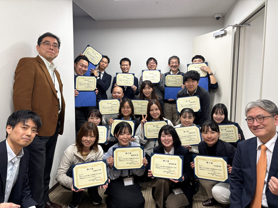 続いては意見交換交流会。当日ご参加いただいたみなさまが、自治体と企業がそれぞれ入る5-6名のグループに分かれ、成果発表の気づきや感想などを共有しながらの交流時間となりました。最後は、受講生のみなさんへの修了証授与と、講義を主に担当した松本所長と中西英一郎客員研究員からの総括でフィナーレとなりました。